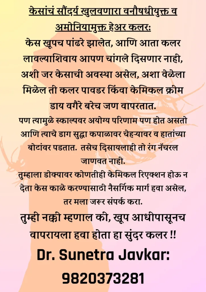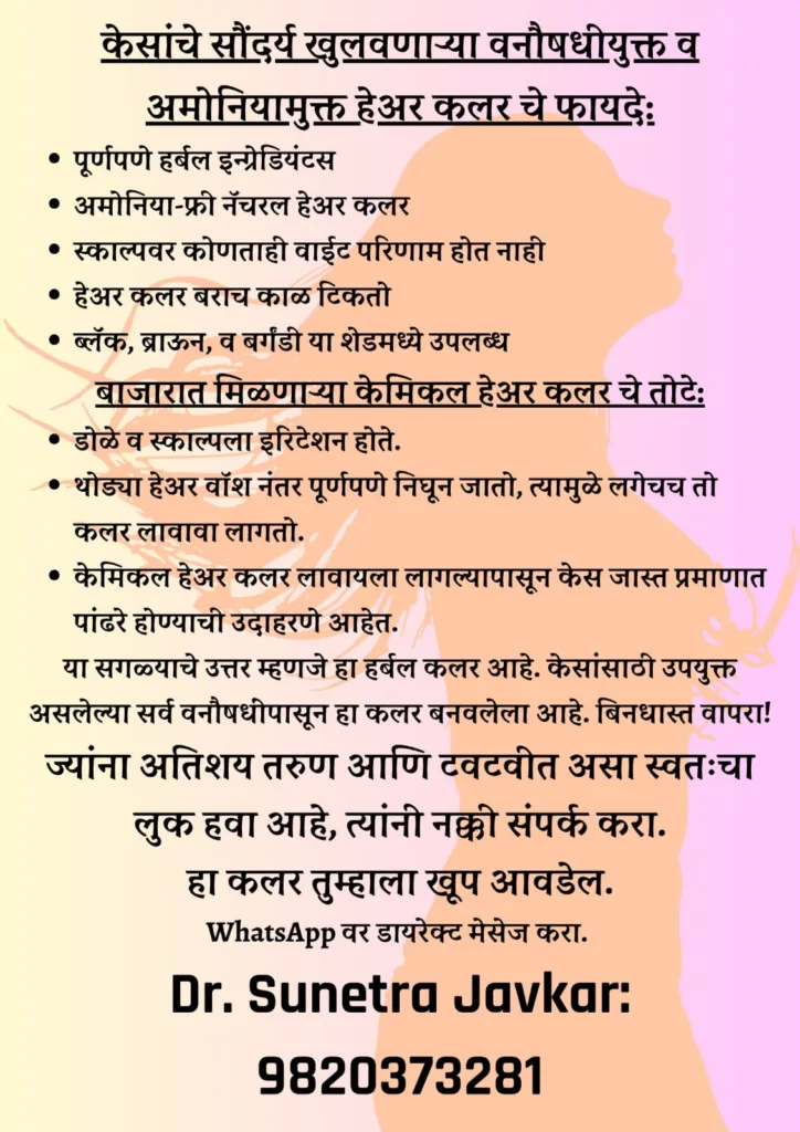 या सगळ्याचे उत्तर म्हणजे हा हर्बल कलर आहे. केसांसाठी उपयुक्त असलेल्या सर्व वनौषधींपासून हा कलर बनवलेला आहे. बिनधास्त वापरा! ज्यांना अतिशय तरुण आणि टवटवीत असा स्वतःचा लुक हवा आहे, त्यांनी नक्की संपर्क करा. हा कलर तुम्हाला खूप आवडेल.